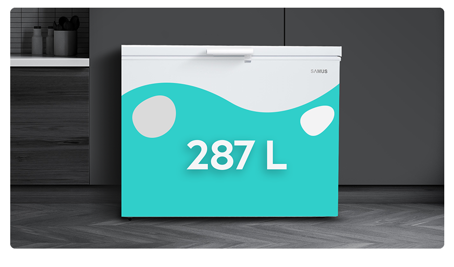 Cu un volum de 287 litri, lada frigorifica Samus este extrem de incapatoare. Congelezi o cantitate mare de alimente si profiti la maxim de intregul interior al acesteia. Iar pentru produsele de dimensiuni reduse, ca sa le gasesti repede, exista in partea dreapta un cos de depozitare din aluminiu. Acesta poate fi scos in cazul in care nu ai nevoie de el.